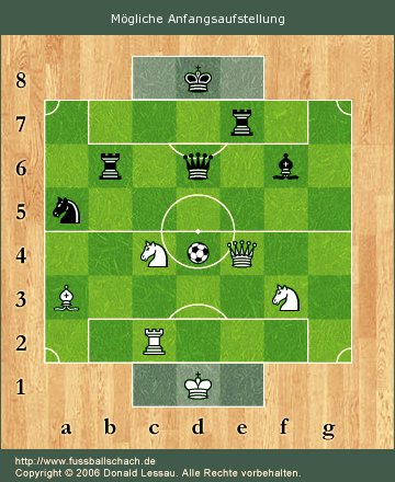 Eine mögliche Anfangsaufstellung. Weiß stößt an und spielt mit zwei Springern gegen zwei Türme. Verschiedene Spielphilosophien treffen aufeinander.